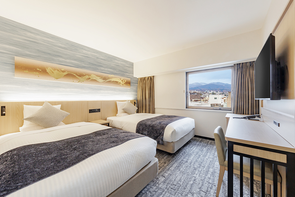 2024年にリニューアルした客室は、幅110cmまたは120cmのベッド2台を備え、ゆったりとおくつろぎいただけます。